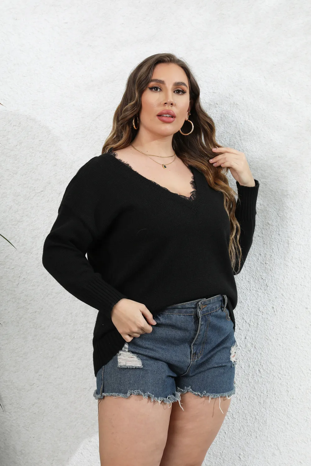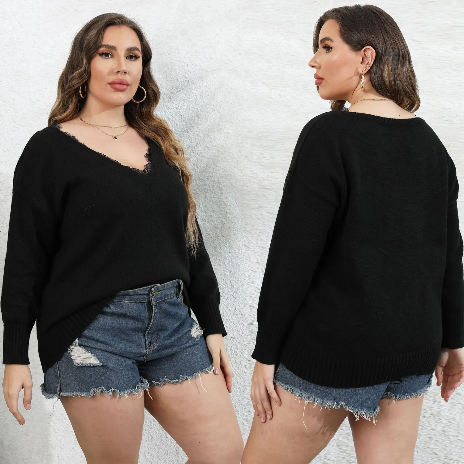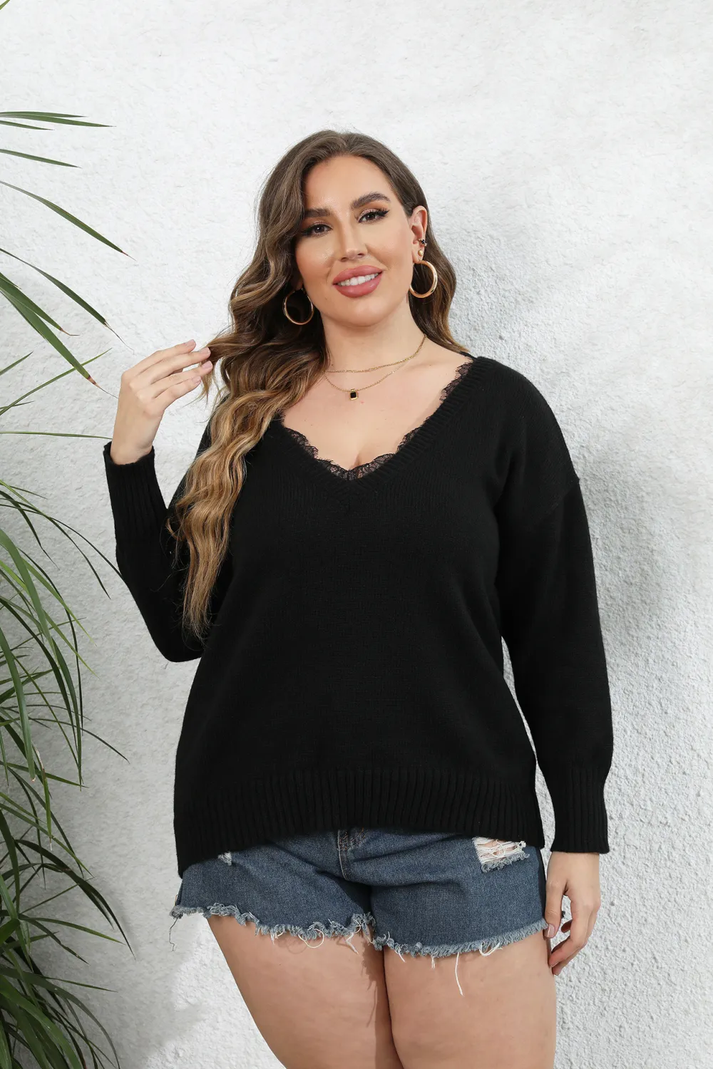 | Product Name | Ladies Fall Winter Woven Top Plus Size Ladies’Lace Patchwork V Neck Pullover Sweater |