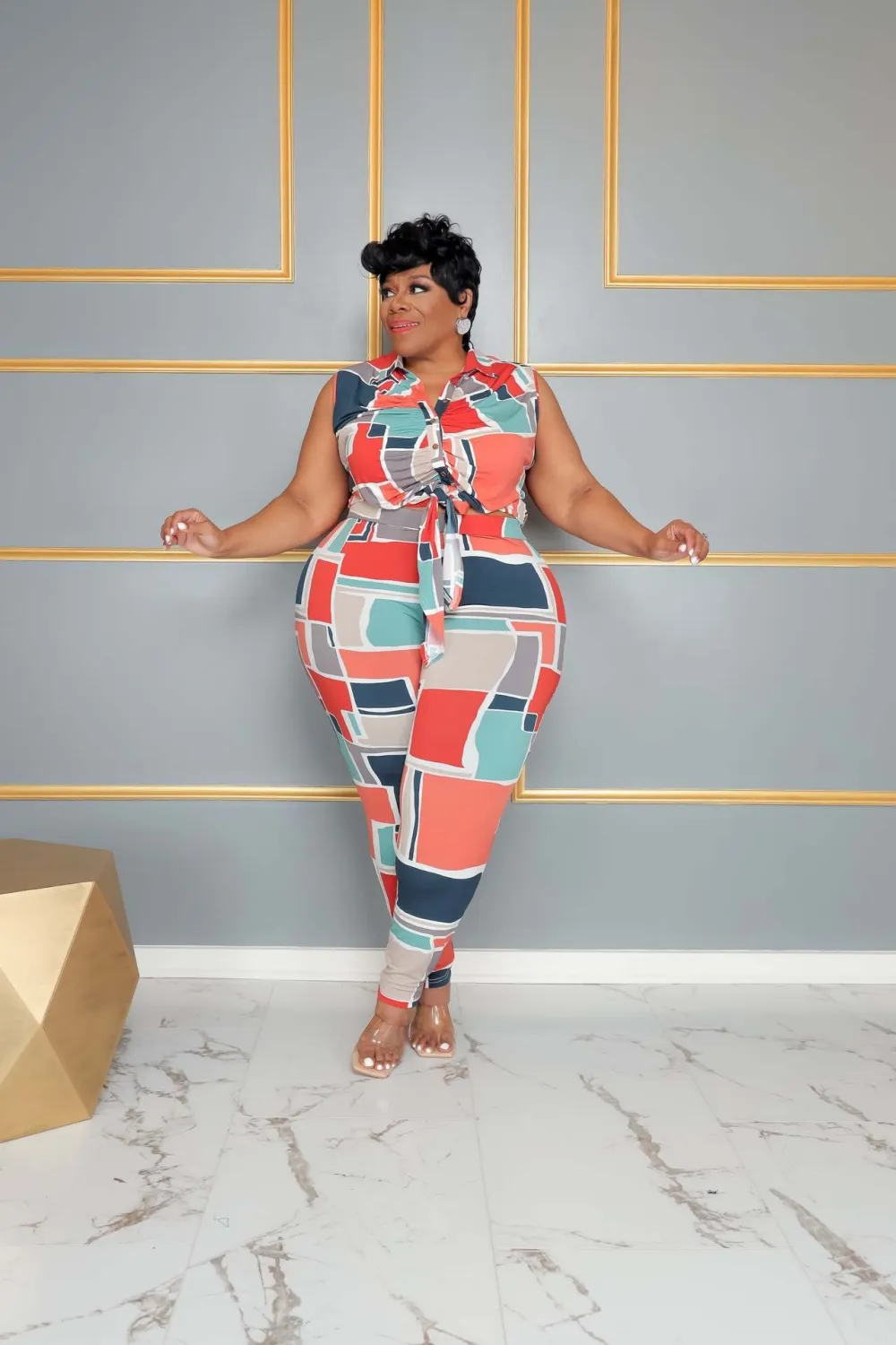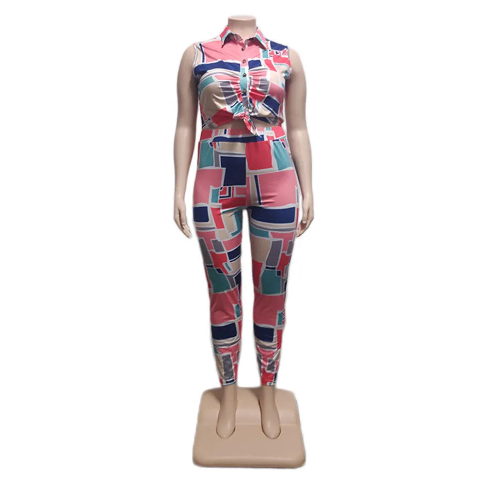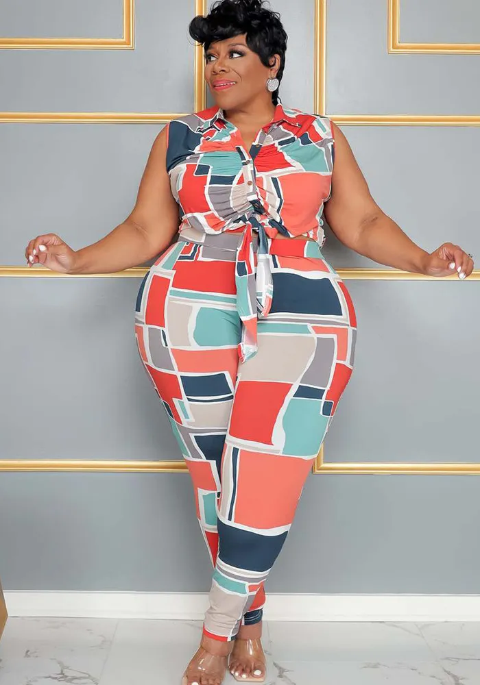 | Product Name | Plus Size Multi-Color Graphic-Print Slim Fit Two-Piece Set |