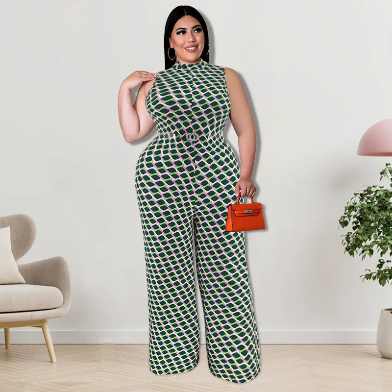 | Product Name | Plus Size Women Clothes Elegant Plaid Stand Collar Sleeveless Wide Leg Jumpsuit |