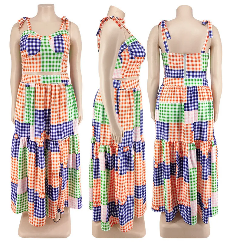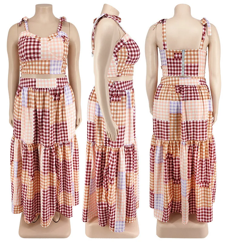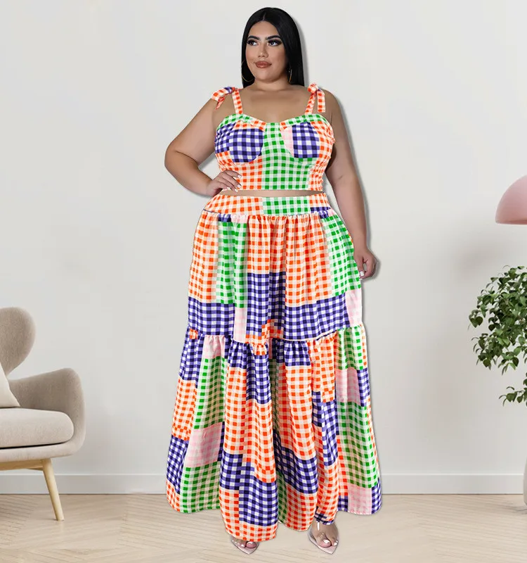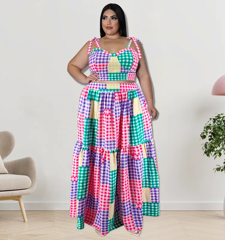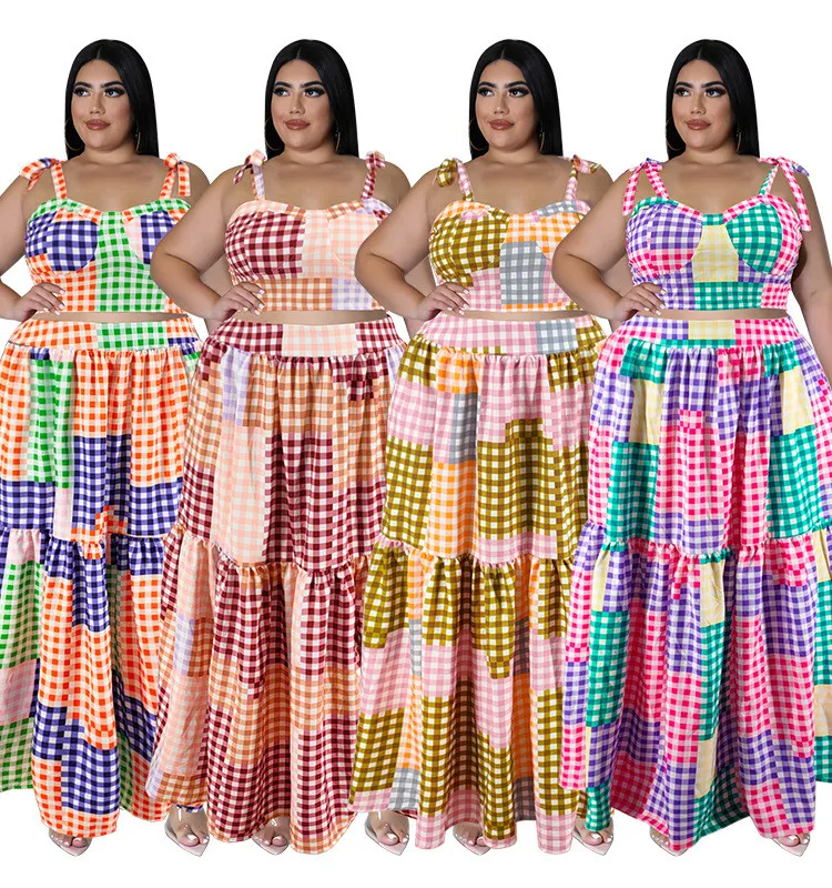 This Plus Size Women Clothes Summer Plaid Crop Strap Top Loose Swing Skirt Two Piece Set Design And Made Of Comfortable And Elastic Fabric. Wholesale Plus Size Two Piece Sets Is a Must-Have Item For Curvy Ladies. Two Piece Sets Can Either Be Worn Together Or Individually, So You Can Combine Them Endlessly. Global Lover Offer Wide Range Selection And Hope Curvy Ladies Find Here a Warm And Exciting Place To Shop Cheap 2 Piece Suits Xl To 6xl. When You Need More Wholesale Plus Size Styles, You Can Always Find What You Need On Our Plus Size Best Online Site.