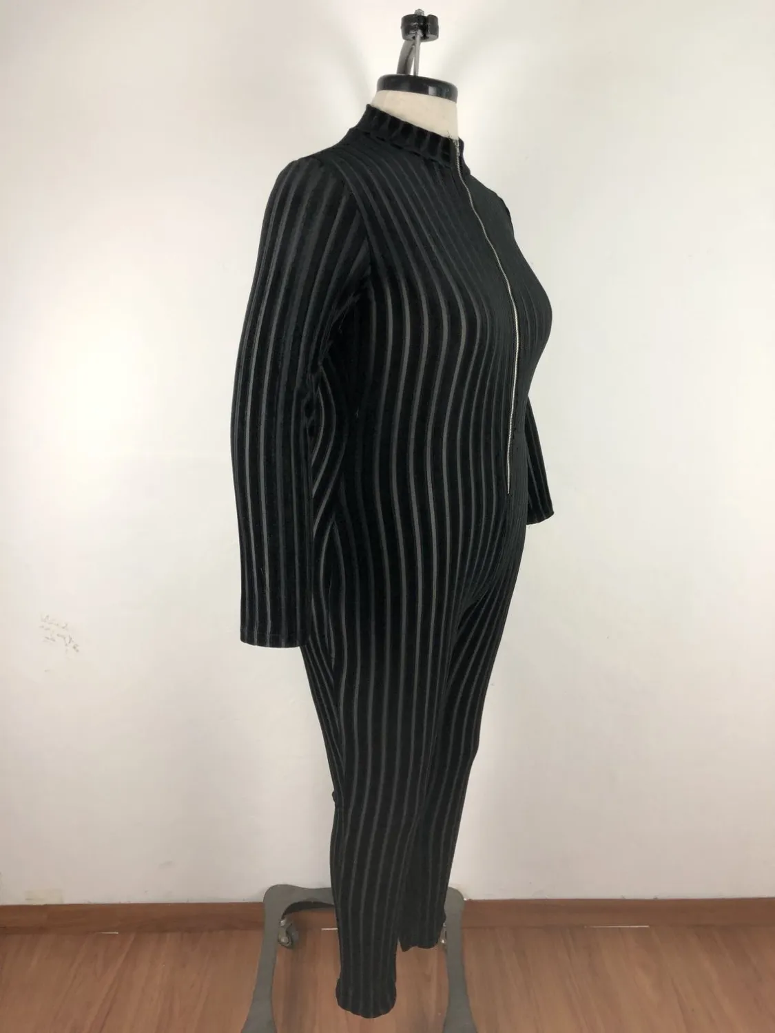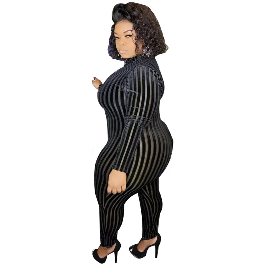 | Product Name | Plus Size Women’S Mesh Flocked Stripe Tight Fitting Zip Long Sleeve Jumpsuit |