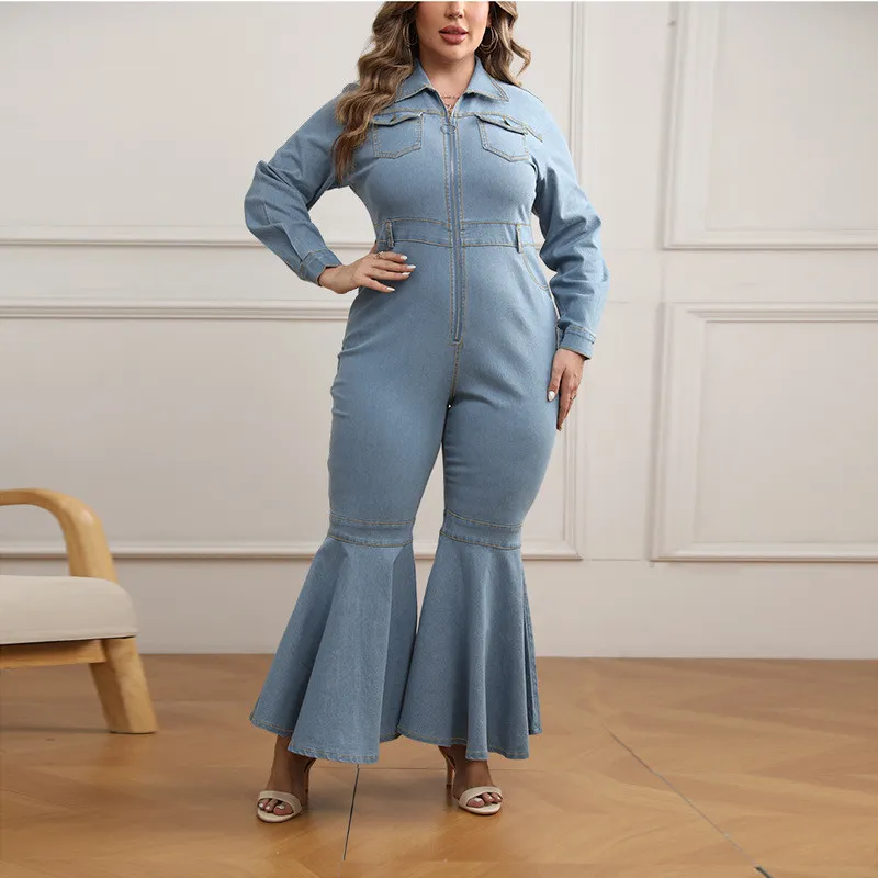 | Product Name | Plus Size Women’s Zipper Turndown Collar Long Sleeve Bell Bottom Denim Jumpsuit |