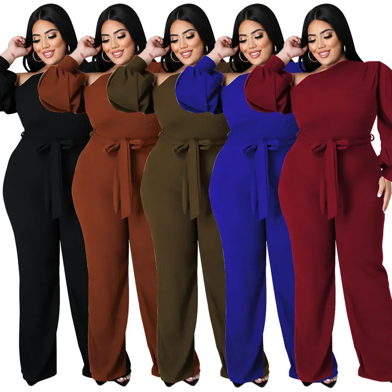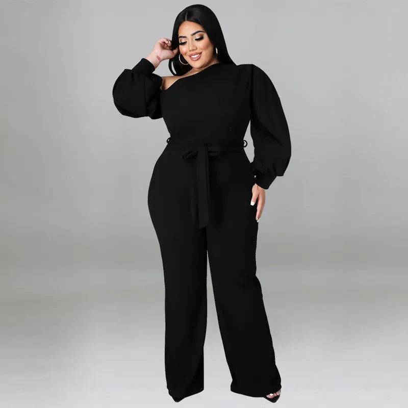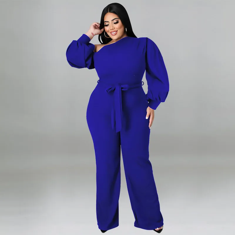 | Product Name | Plus Size Women Solid Balloon Sleeve Slash Shoulder Belted Jumpsuit |