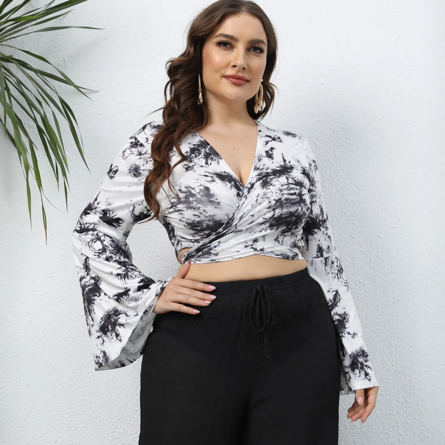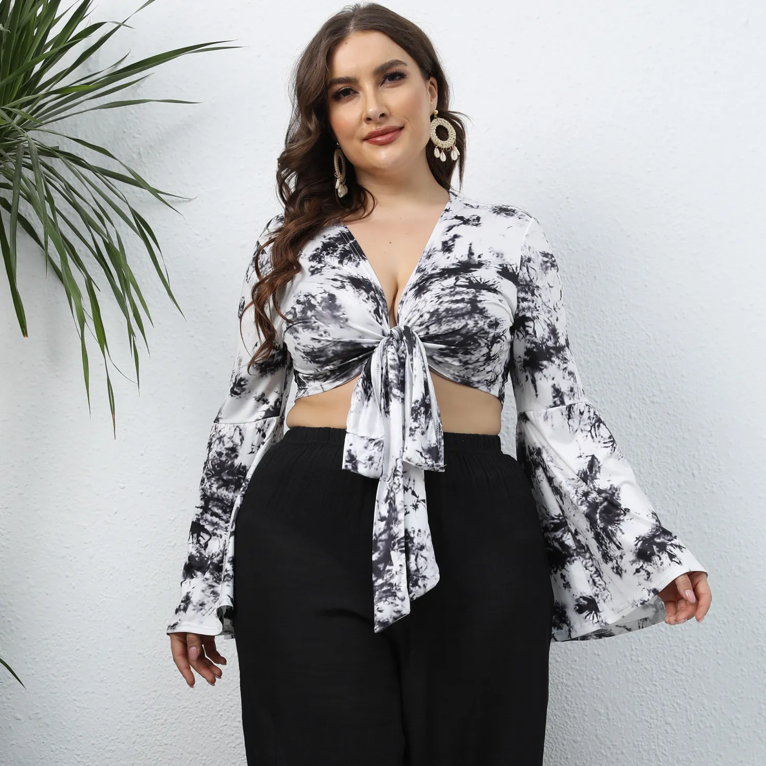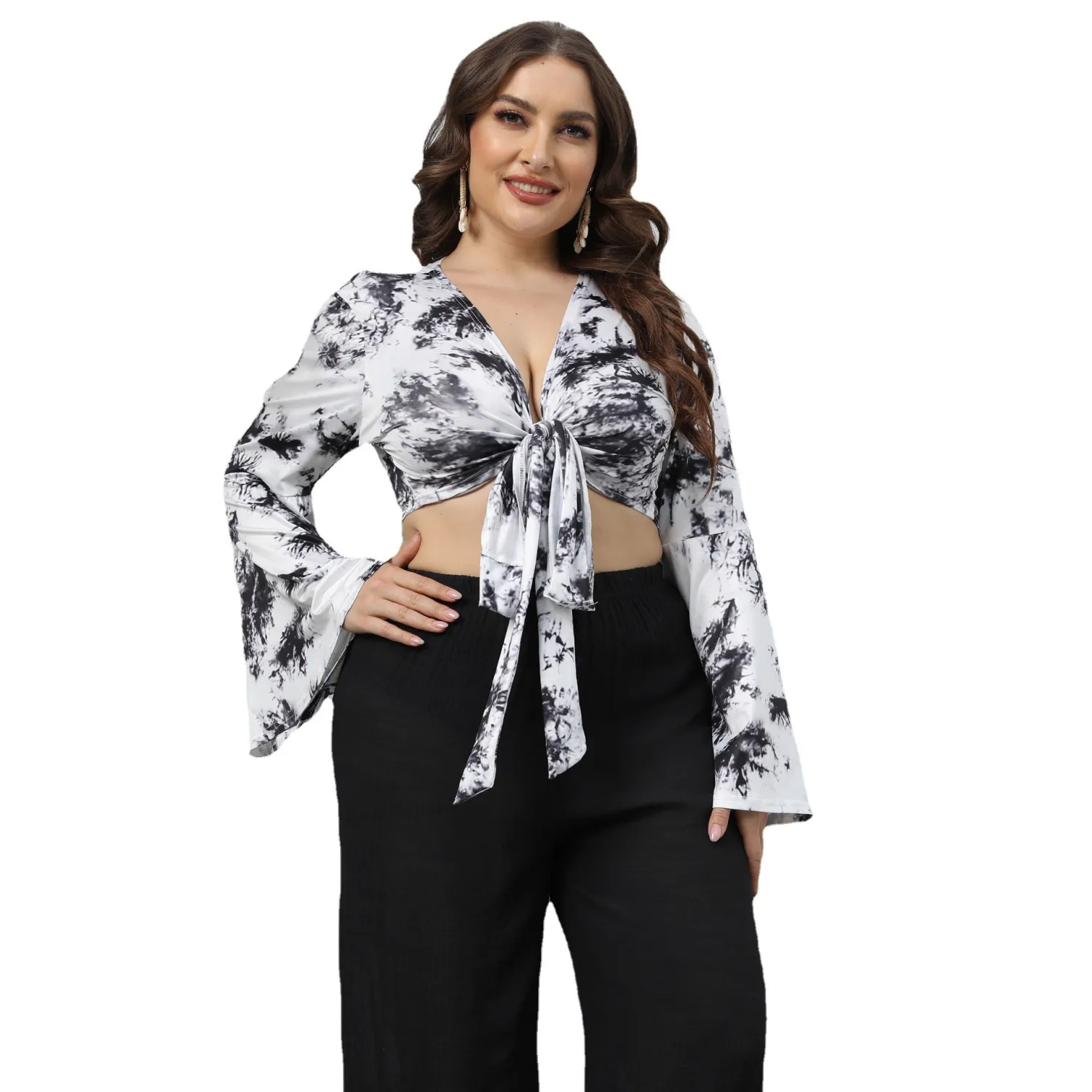 This Plus Size Women Tie Dye Print Lace-Up Deep v Bell Bottom Sleeve Long Sleeve Crop Top Made Of Comfortable And Elastic Fabric. It Is Wholesale Sexy Plus Size Tops For Women. With The Gradual Rise Of Feminist Awareness, The Mainstream Fashion Of “Beauty With Thinness” In The Past Can No Longer Dominate, Global Lover Advocates That No Matter Whether The Body Is Thick Or Thin, We Are The Most Unique Existence. Fat Girls Can Also Show Off Their Figure Generously. Global Lover Offer All Kinds Of Wholesale Plus Size Blouses And Shirts At Cheap Price And High Quality.