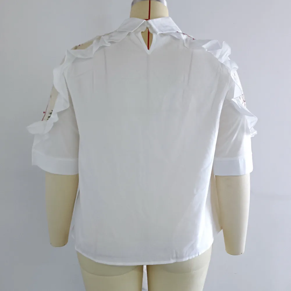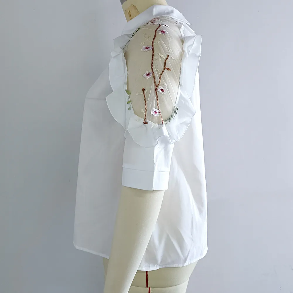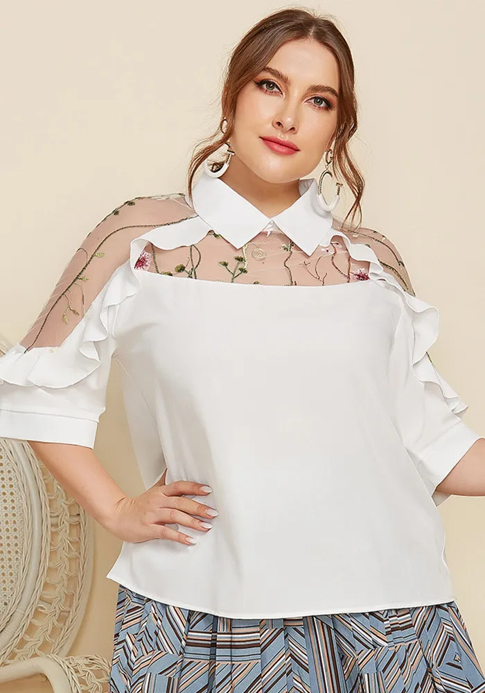 | Product Name | Spring Summer Plus Size Women’s Chic Turndown Collar See-Through Embroidered Patchwork Ruffle Edge Half-Sleeve Shirt |