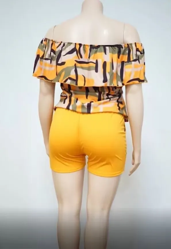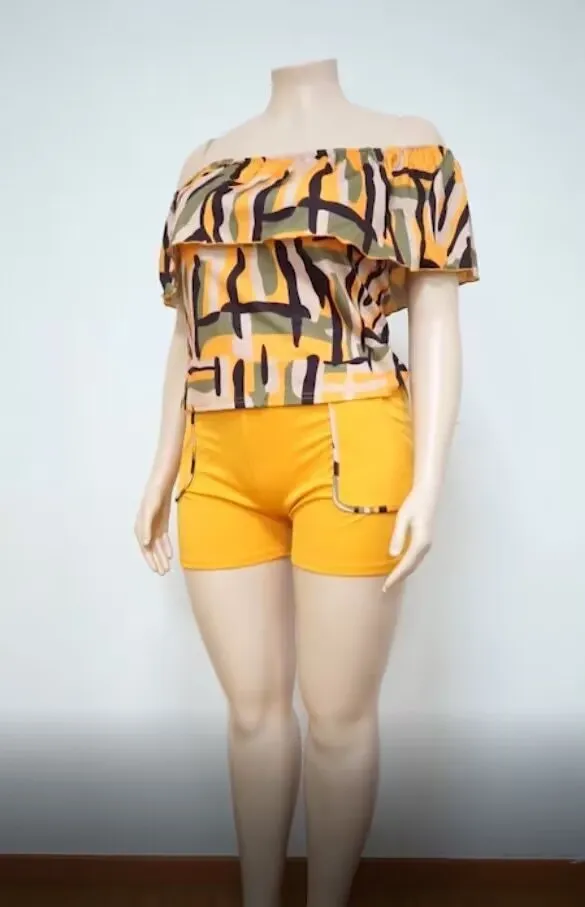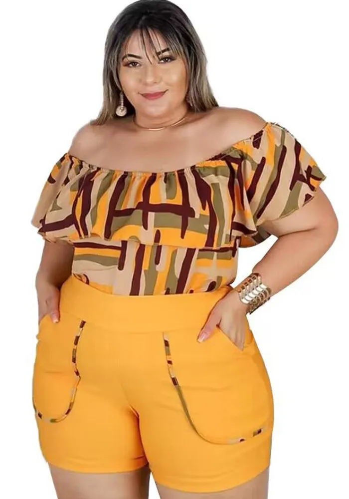 | Product Name | Summer Contrast Geometric Print Plus Size Women’s Casual Off Shoulder Two-Piece shorts set |