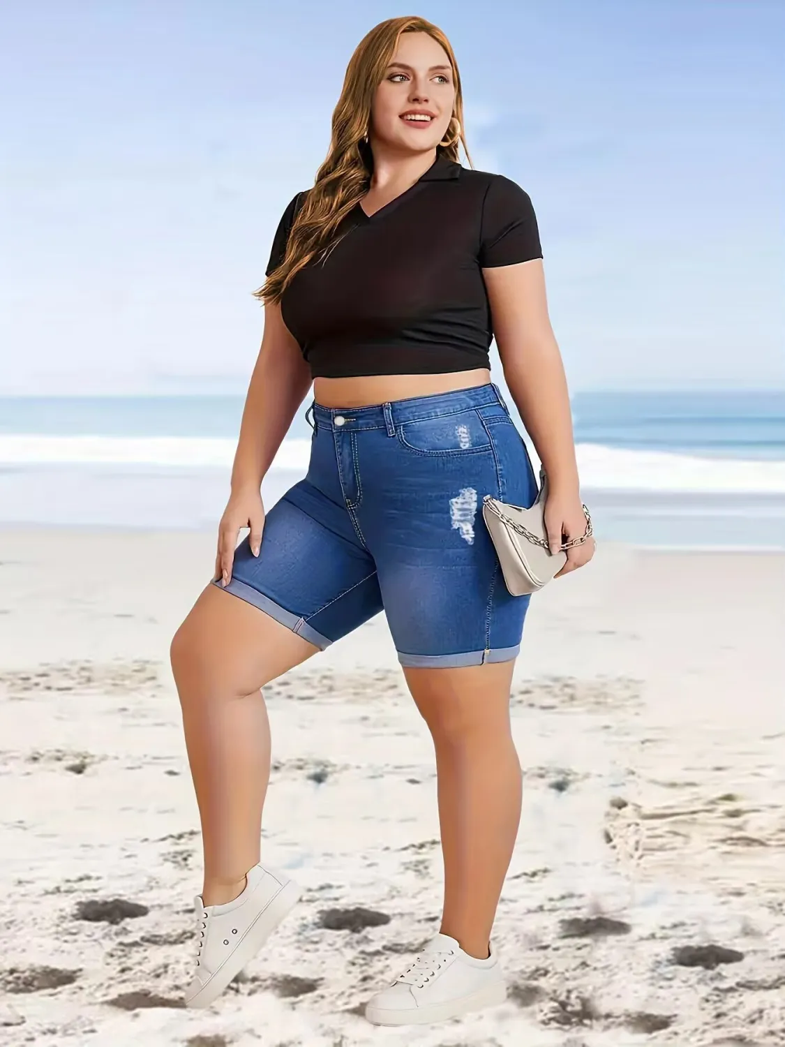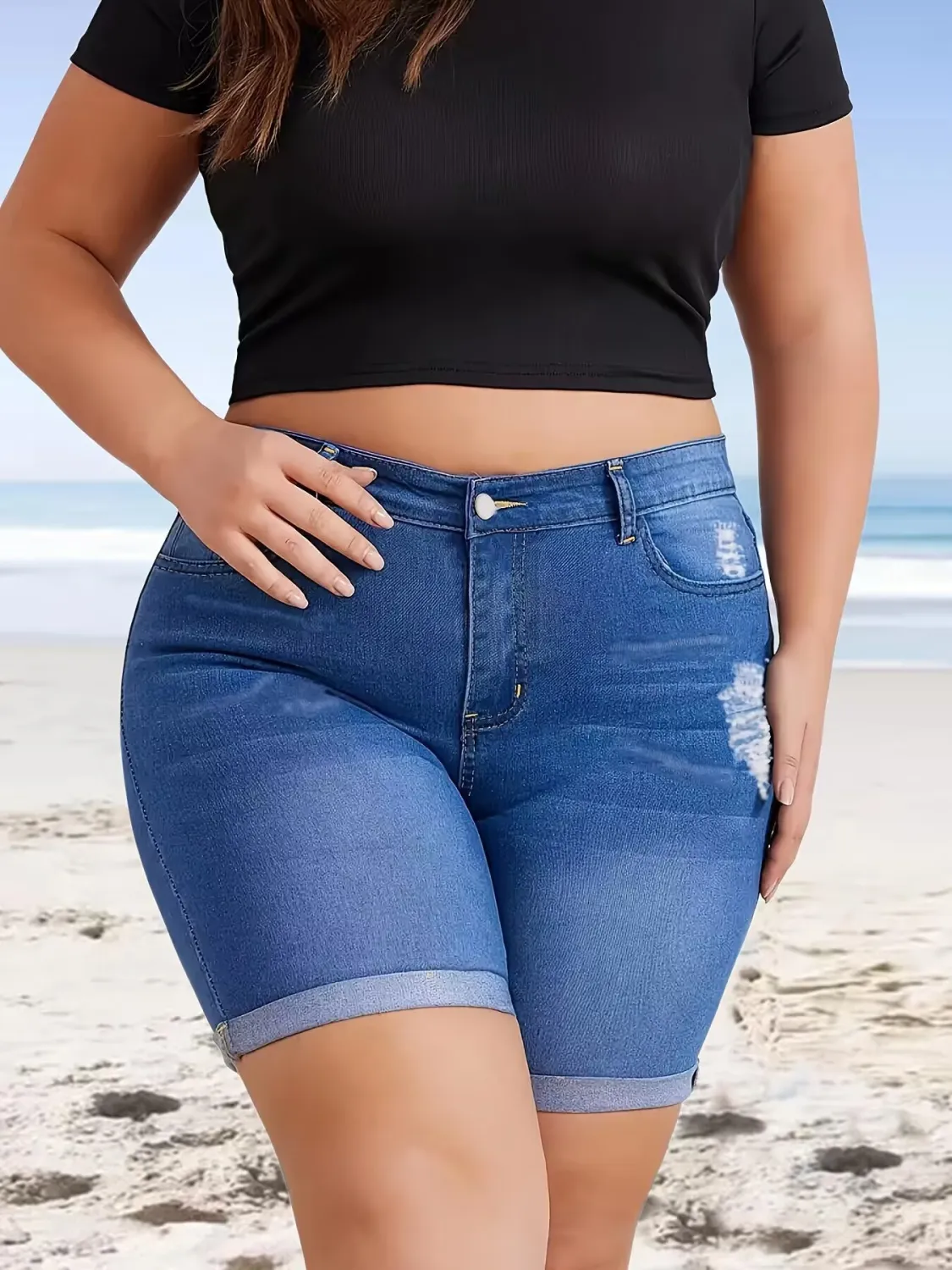 This Summer Ripped Denim Shorts Stretch Plus Size Knee-Length Shorts Design Made Of Durable And Stretchy Material. It Is a Must-Have Item For Your Closet. Global Lover Offer a Rich Selection Of Wholesale Plus Size Bottoms. You Will Find Wide Range Fabric, Colors, Cut, And Designs Sexy Plus Size Trousers That Is Acturally On Trend And Cheap Price On Our Wholesale Plus Size Clothing Online Store.