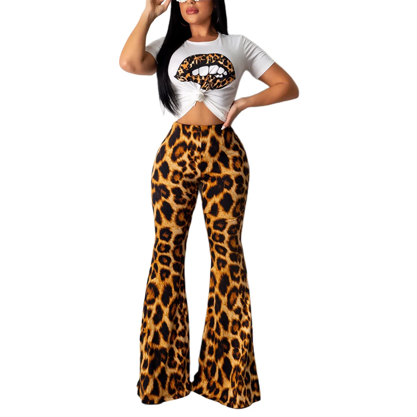 | Product Name | Women’S Sexy Lips Print T-Shirt Leopard Print Bell Bottom Pants Two-Piece Set |