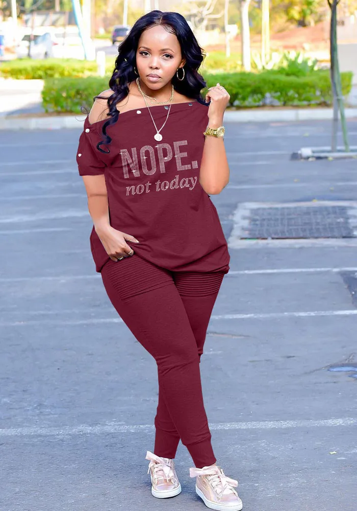 | Product Name | Women Summer Burgunry Casual Slash Neck Short Sleeves Letter Print Button Top Plus Size Two Piece Pants Set |